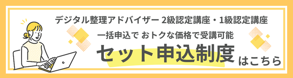 ・2級受講日から1ヶ月以内に1級をお申し込みの方は、早割価格でご受講いただけます。詳しくはデジタル整理アドバイザー1級認定講座概要欄をご確認ください。