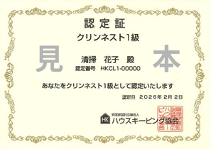 ウェブサイト上で合格通知の後、約1か月で「クリンネスト1級」の認定証と「クリンネスト実技士認定予備講座※」の割引券が郵送にて送られます。NPO法人ハウスキーピング協会より、クリンネスト1級として認定・登録されます。(カード式認定証をご希望の場合はこちら)※「クリンネスト実技士認定予備講座」とは、1級取得者だけが受講できる、掃除を実際に講師と共に学べる「実技」講座です。33,000円の講座が、割引価格22,000円(税込)で受けられます。