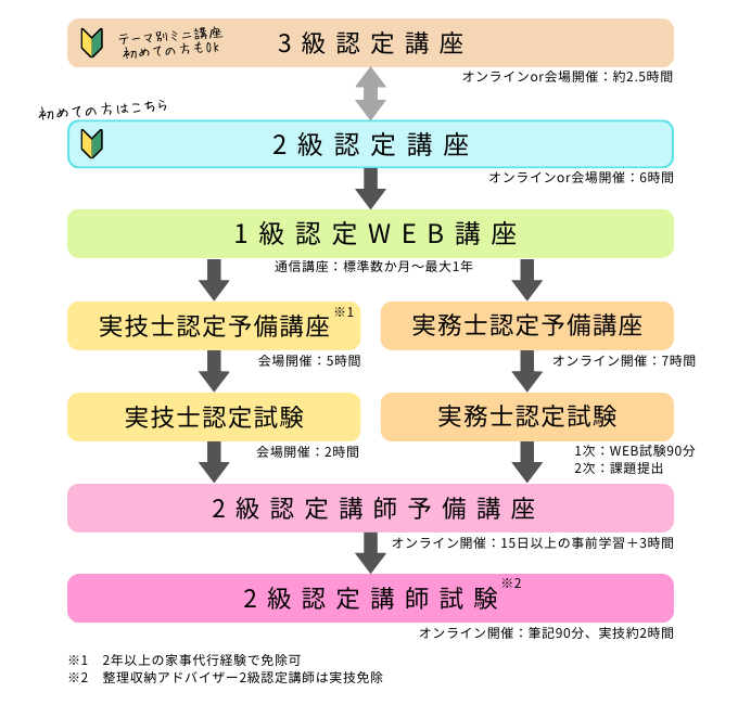 (2級講座以降はステップをふんで進んでいくので、順番を飛ばしての受講はできません。)