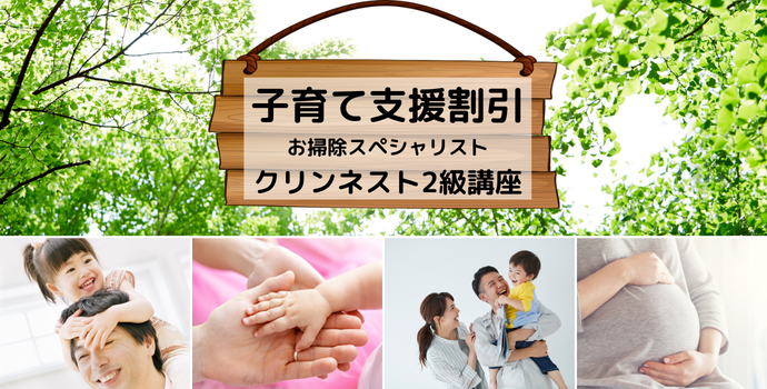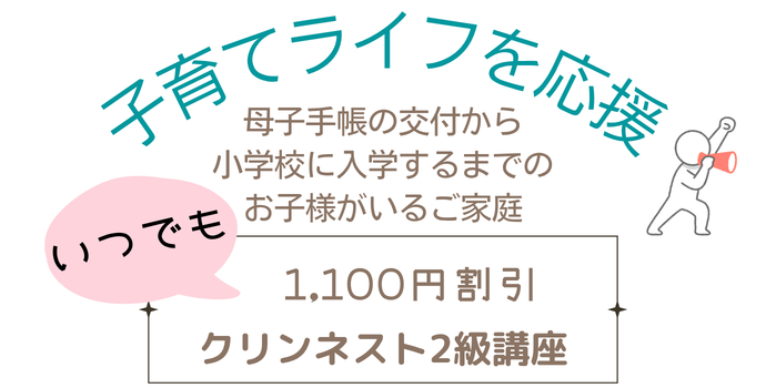 母子手帳の交付から~小学校に入学するまでのお子様がいるご家庭の方は、クリンネスト2級講座がいつでも1,100円割引!受講すると資格も取得できます。