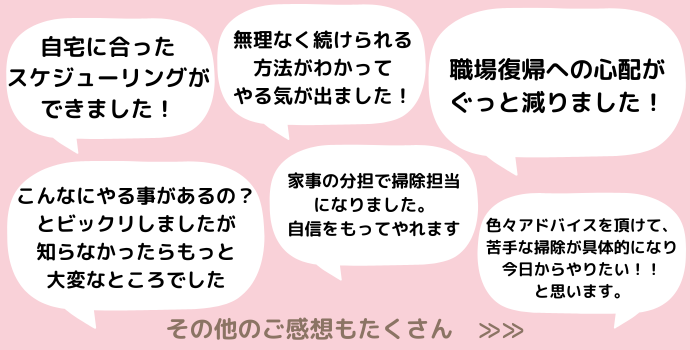 自分の家に合わせて取り入れられるお掃除を学ぶことができます。日々の暮らしに活かせることはもちろん、お仕事でのお掃除にも幅広く活かせます。