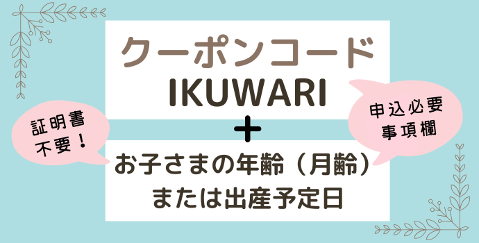 ① 『申込必要事項欄』にクーポンコード【IKUWARI】と、お子さまの年齢(月齢)または出産予定日を入力